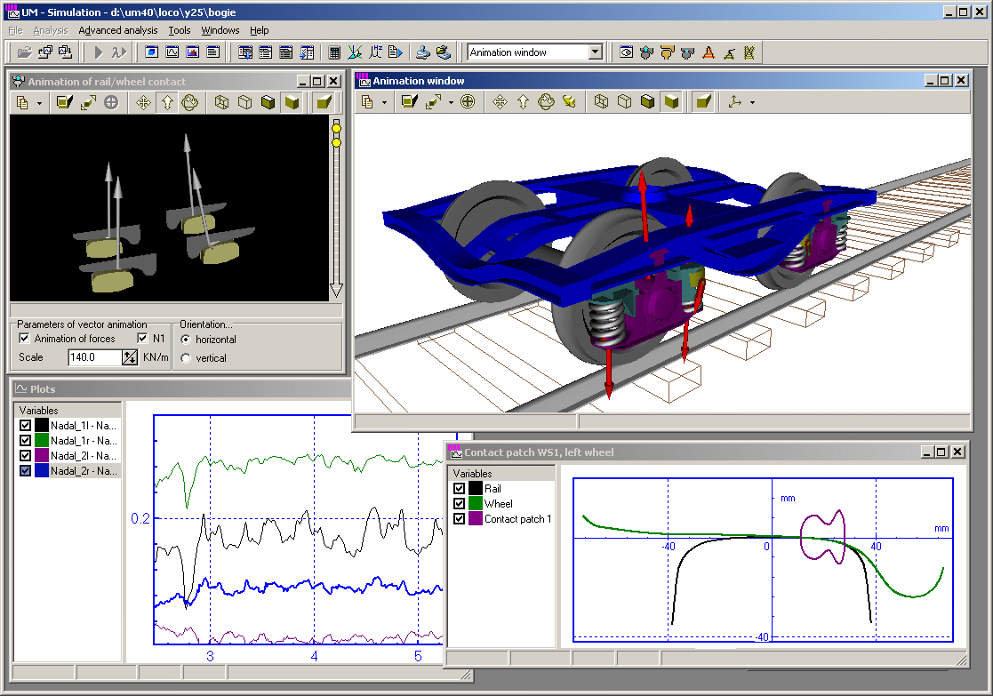 Разработанные модели позволяют исследовать основные динамические характеристики вагонов (коэффициенты запаса устойчивости, коэффициенты динамики рессорных комплектов, рамные и боковые силы, ускорения отдельных точек кузова и так далее) в прямых и кривых участках пути с учетом детерминированных и случайных неровностей путем интегрирования дифференциальных уравнений движения (уравнения автоматически генерируются программным комплексом УМ); варьировать основные геометрически и инерционные параметры, параметры пружин подвески, а также параметры, характеризующие износ элементов ходовой части (фрикционных клиновых гасителей, пятниковых и буксовых узлов) на базе полной параметризации модели; исследовать движение вагона при различных профилях колес и рельсов, жесткостных характеристиках пути с использованием различных моделей сил крипа, при различных значениях коэффициента трения в контакте; исследовать процессы всползания колеса на рельс, отрыва поверхности катания колеса от рельса, а также процесс схода колесной пары с рельса.